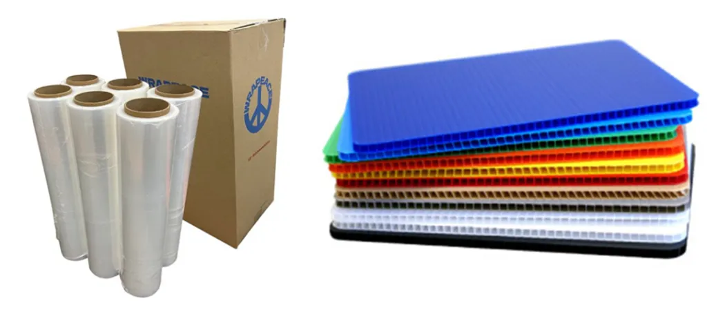 弊社では粘着性の高いテープ(凹凸面でもしっかり固定ができる)、ストレッチフィルム(薄さが通常の半分にもかかわらず耐久性抜群)、プラスチック段ボール(紙の段ボールより軽量で水や湿気に強い)を取り扱っております。